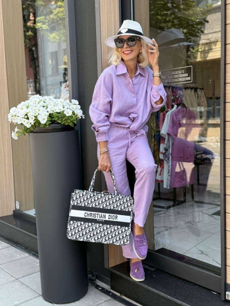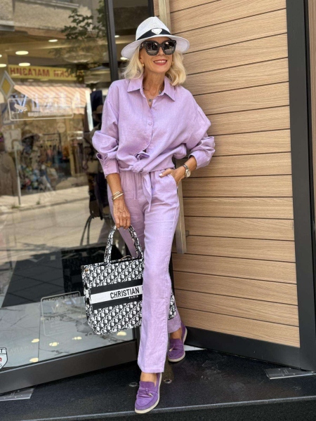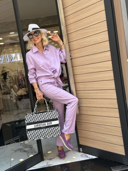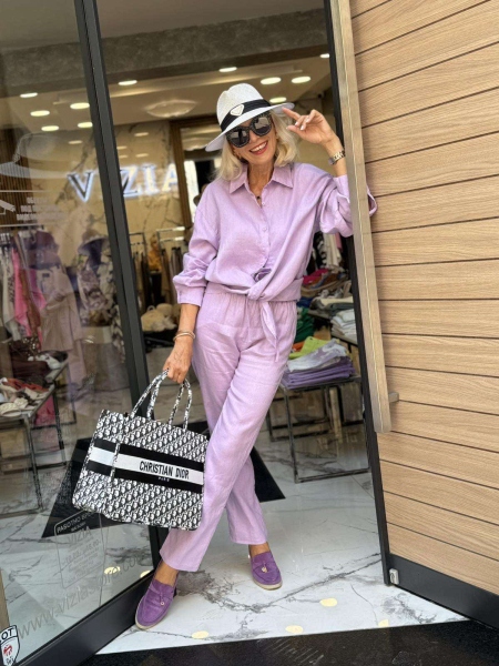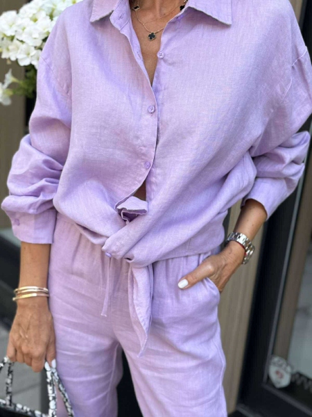Ленен комплект в светло лилав цвят от две части. Ризата е със свободен силует и се закопчава с копчета. Панталонът е с прав крачол и ластик на талията.