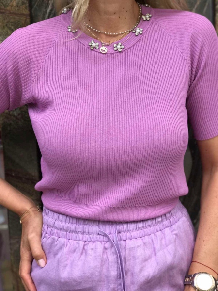 Блуза от фино плетиво с къс ръкав в лилав цвят. Блузата е декорирана с камъчета по деколтето. Размерът е универсален и е подходящ за S, M.