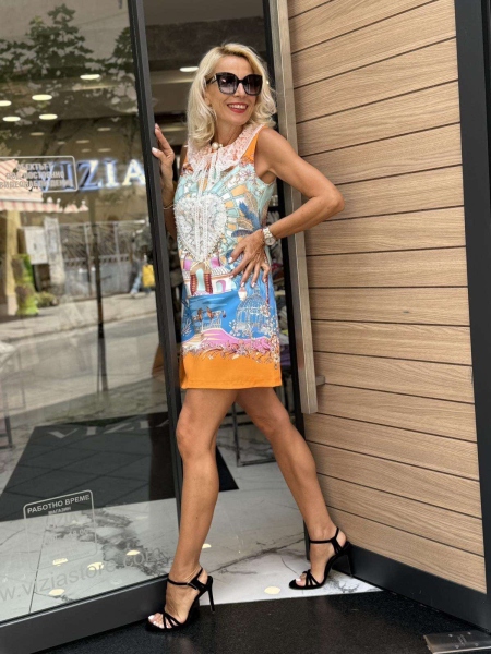 Рокля тип "трапец" без ръкав с пъстър десен. Моделът пада свободно и се закопчава с цип.