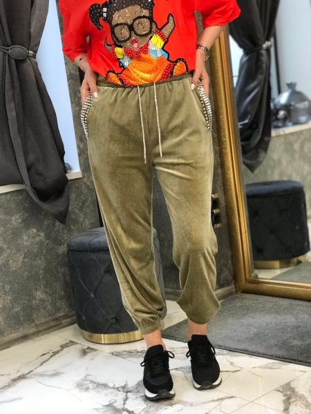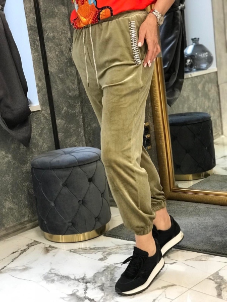 Панталон от плюшена материя в бежов цвят с декорация от камъни по джобовете. Моделът е на ластик в талията и в края на крачолите.