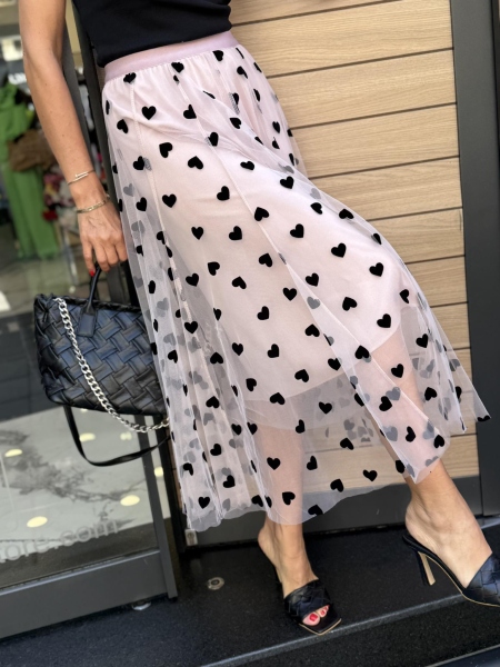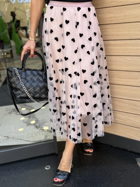Тюлена пола в розов цвят с дължина под коляното. Моделът е с ластик в талията. Размерът е универсален и е подходящ за S, M, L.