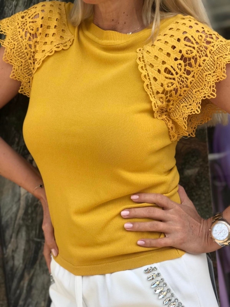 Блуза в жълт цвят с кройка по тялото. Моделът в горната част е с дантелен ръкав. Размерът е универсален и е подходящ за S, M.