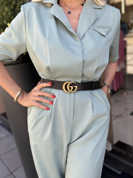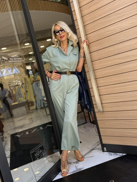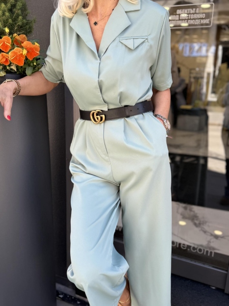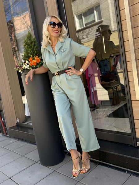 Гащеризон с втален силует в цвят мента. Моделът е с ревери в горната част и се закопчава с копчета в предната част. Размерът е универсален и е подходящ за S, M. Коланът не се предлага към гащеризонът.