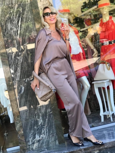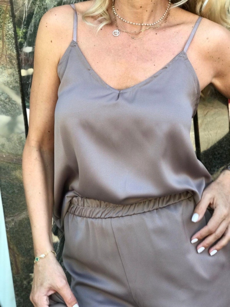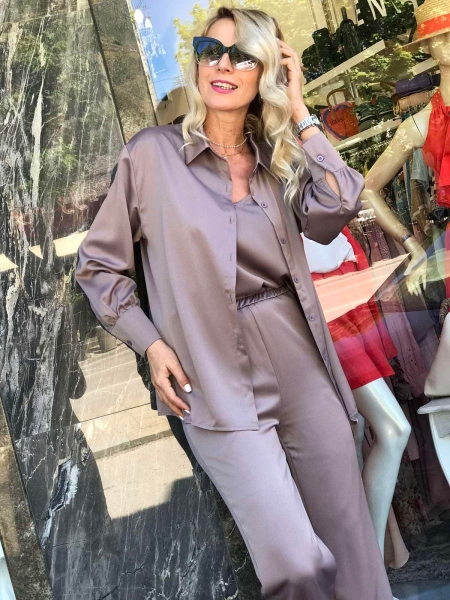 Комплект в три части от сатенена материя. Ризата е със свободен силует. Топът е с тънки презрамки и свободен силует. Панталонът е на тастик в талията и с прави крачоли.