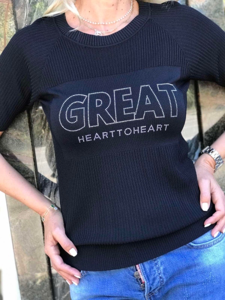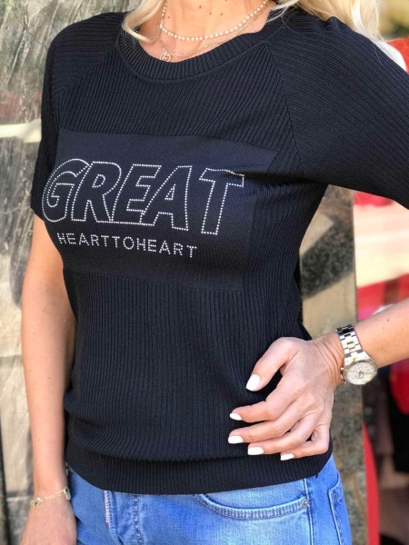 Блуза в черен цвят със свободен силует. Моделът е декориран в предната част с надпис от камъчета. Размерът е универсален.