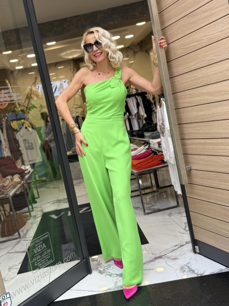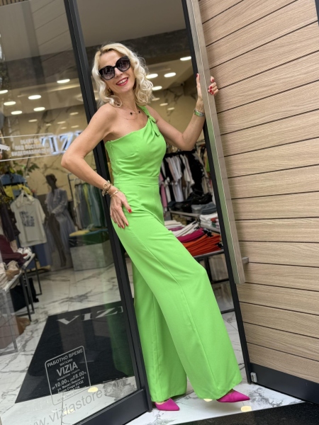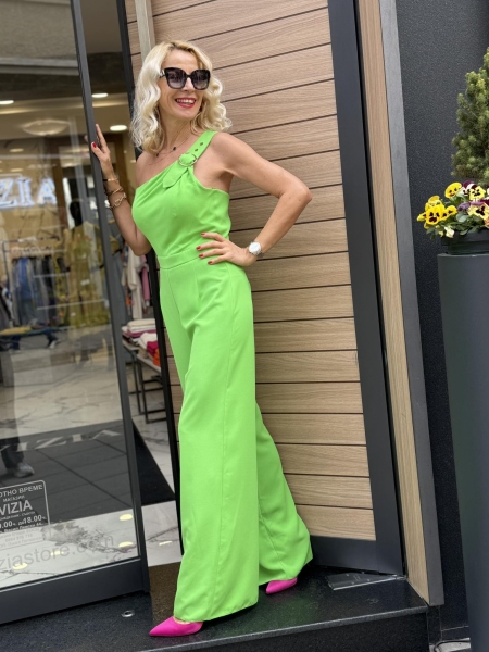 Гащеризно в ярко зелен цвят с широки крачоли. Моделът е с втален силует и се закопчава със страничен цип.