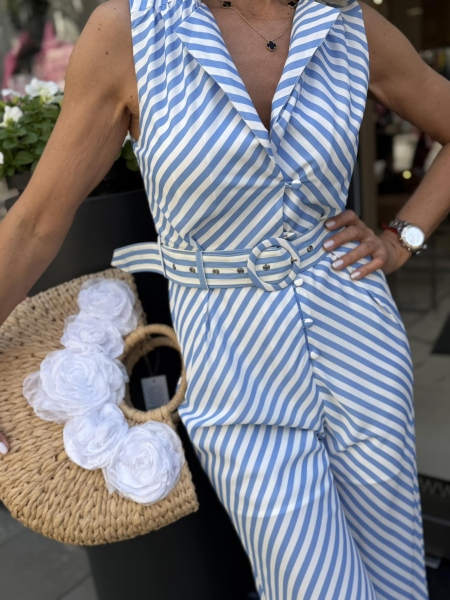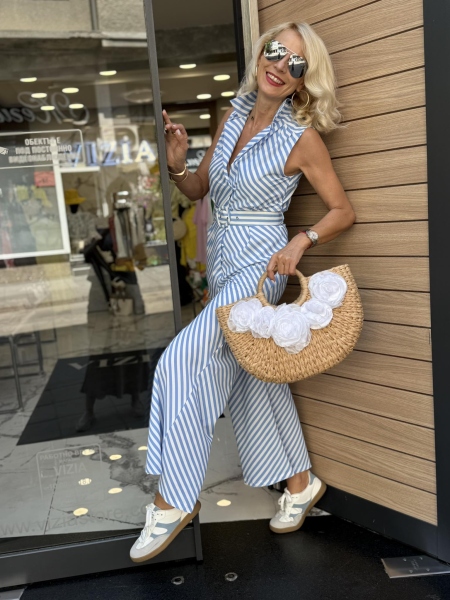 Гащеризон от тънка материя в бяло и синьо райе. Моделът е с втален силует и свободни крачоли. Към него има и колан.