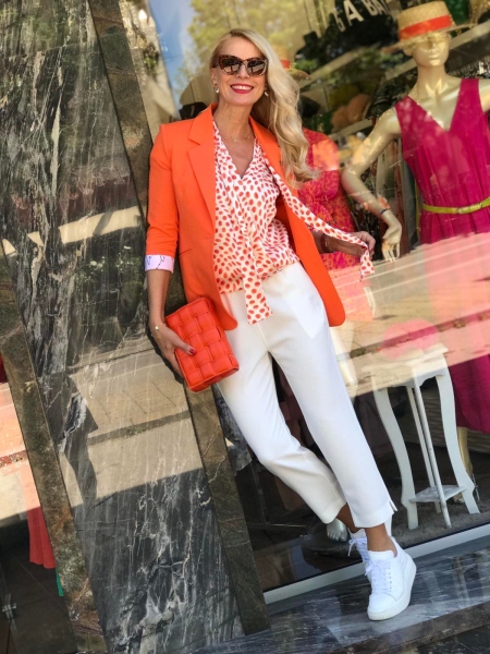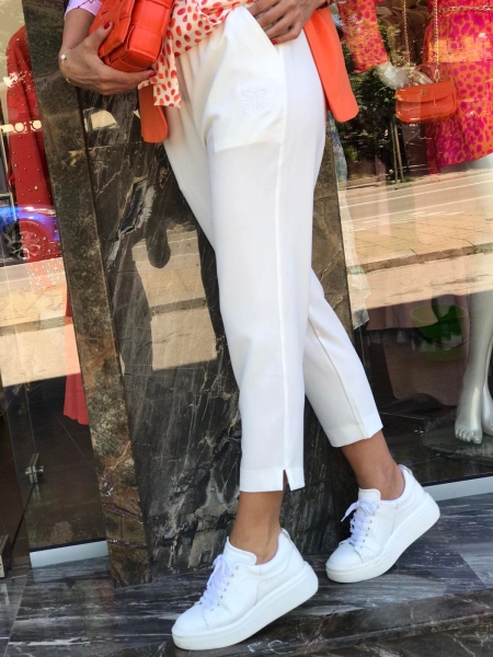Ежедневен панталон от тънка материя в бял цвят. Моделът е тип "цигара" и е с ластик в талията.