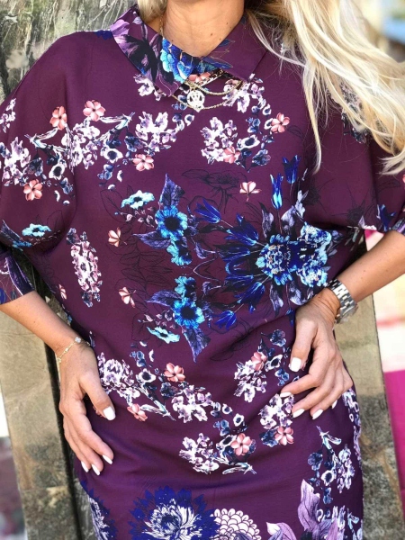Рокля в тъмно лилав цвят с флорален десен. Моделът в горната си част е със свободен силует а в долната част е по тялото. Ръкавите на роклята са 7/8 и има странични джобове.