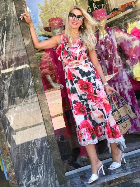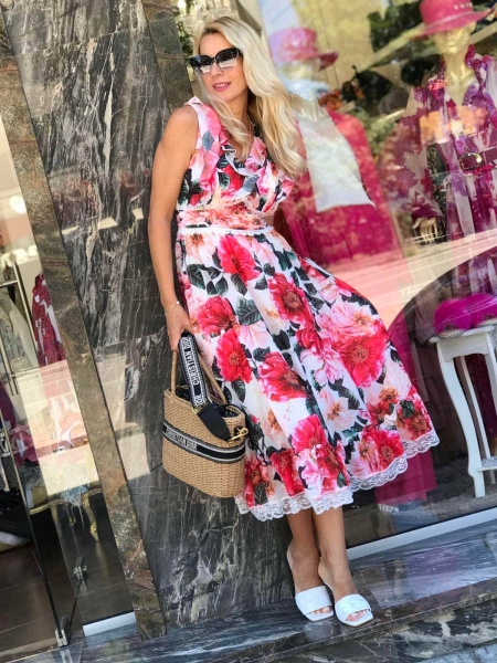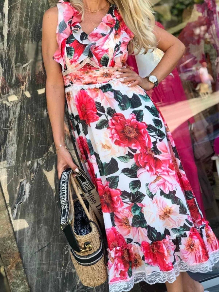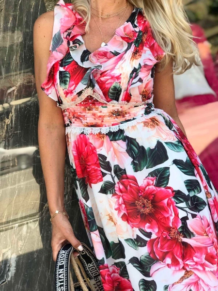 Рокля от тънка шифонена материя с флорален десен. Моделът е с шев на талията и се закопчава със страничен цип.
