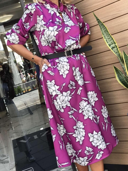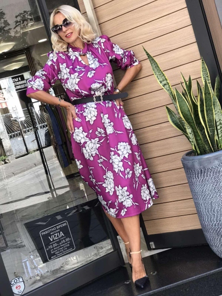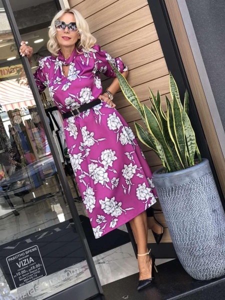 Рокля с прав силует в лилав цвят с десен от бели цветя. Моделът се облича без закопчаване. Към роклята има и колан.