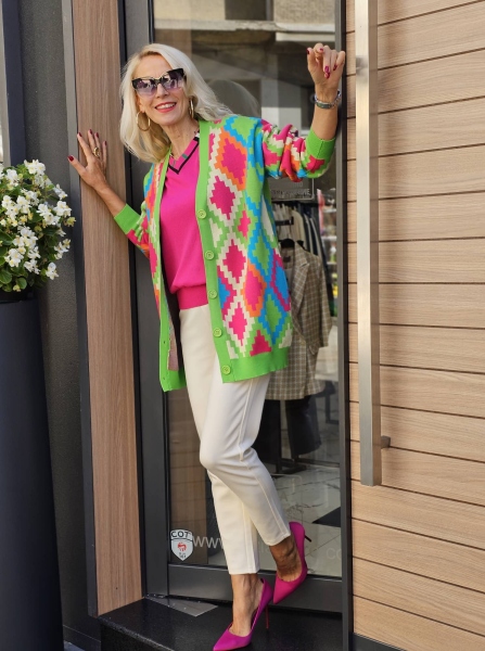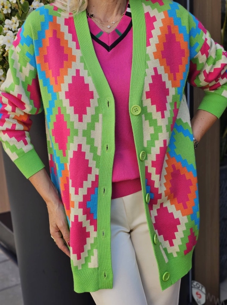 Цветна жилетка със свободен силует с остро деколте. Моделът се закопчава с копчета. Размерът е универсален и е подходящ за M, L, XL.