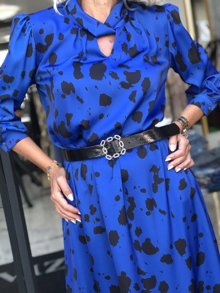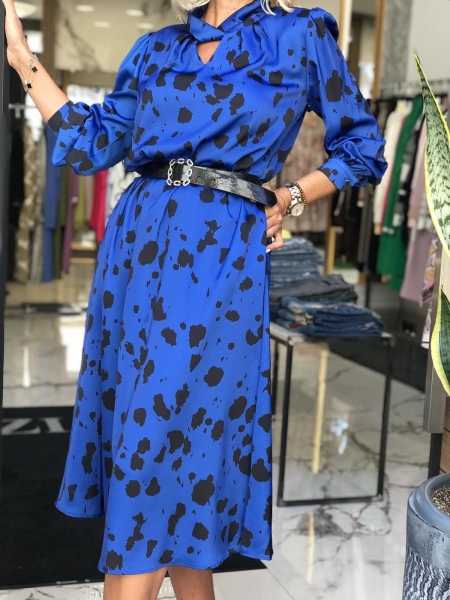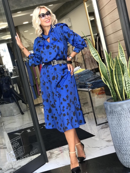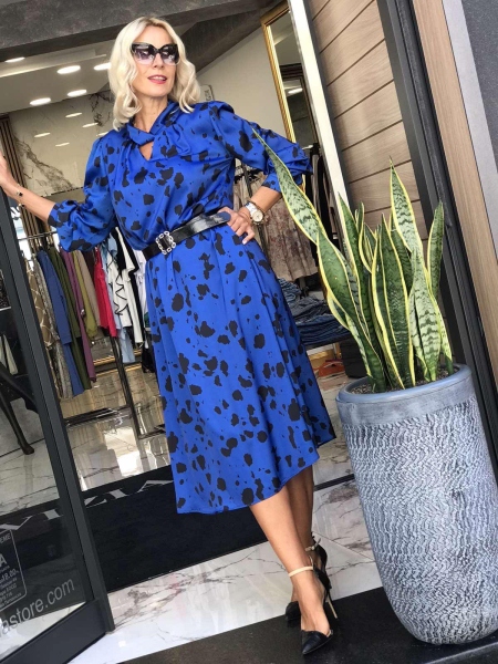 Свободна рокля с дължина под коляното с прав силует. Моделът се облича без закопчаване и към нея има колан за вталяване.