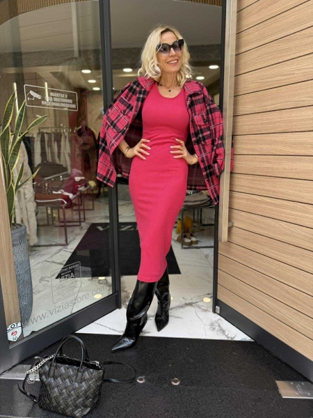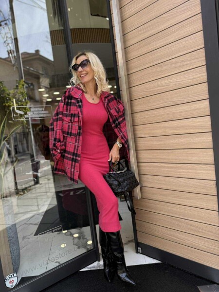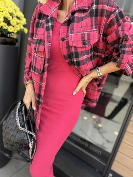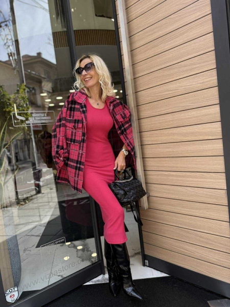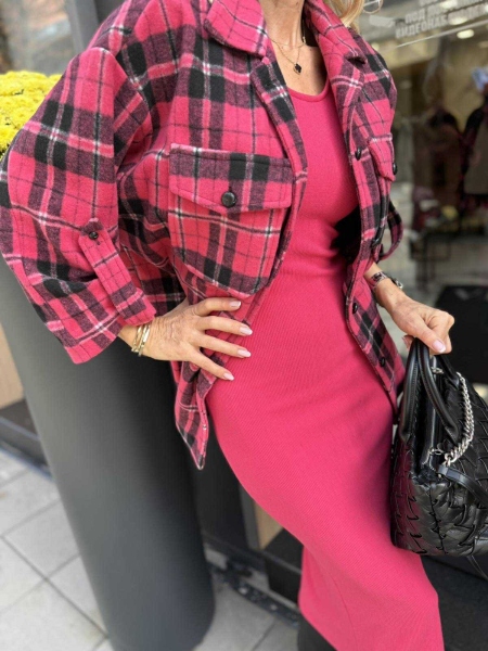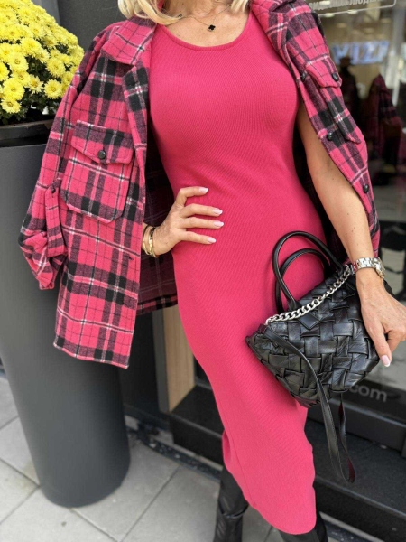 Ежедневен комплект от риза и рокля в цикламен цвят. Ризата е от плътна материя със свободне силует. Роклята е от рипсена материя със слим силует.