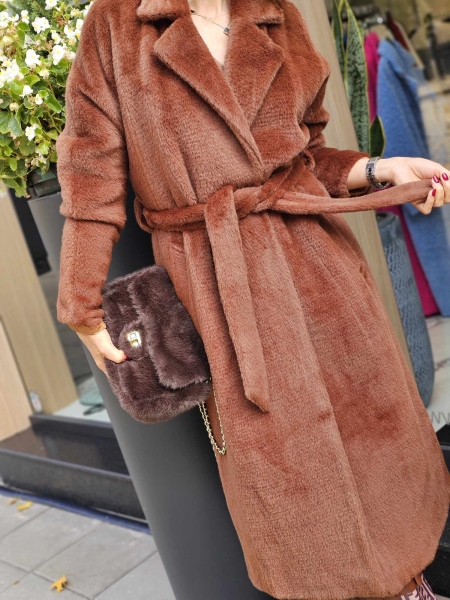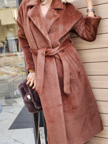 Дълго палто от мека материя със свободен силует. Моделът не се закопчава и има колан към него за талията.