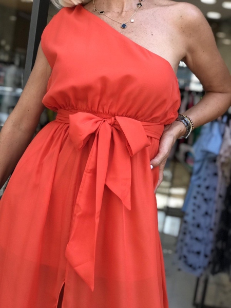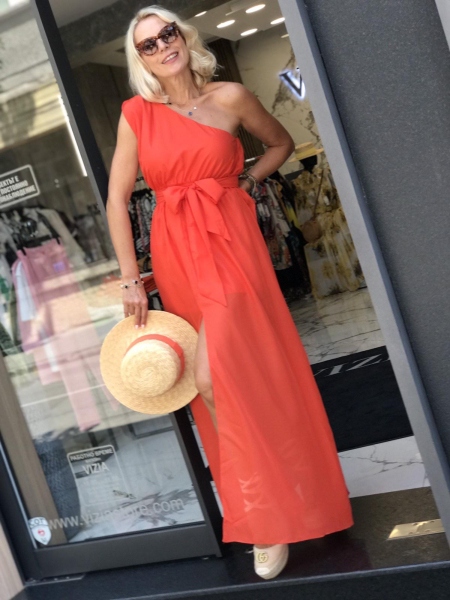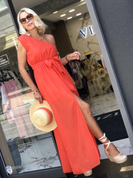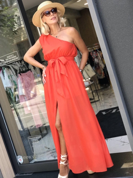 Дълга рокля с едно рамо в коралов цвят с ластик на талията и цепка отпред.Модела е с  подплата която е по-къса.
