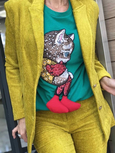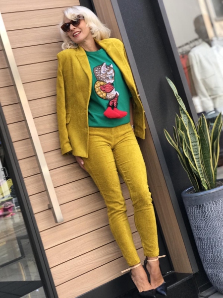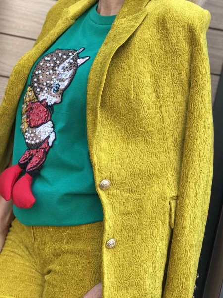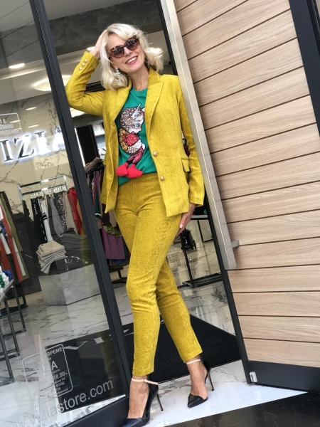 Елегантен комплект в жълт цвят. Сакото е с втален силует и се закопчава с едно копче. Панталонт е по тялото и се закопчава с цип и копче.