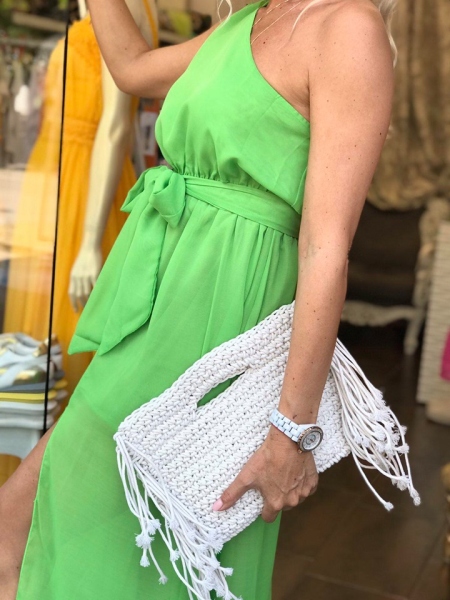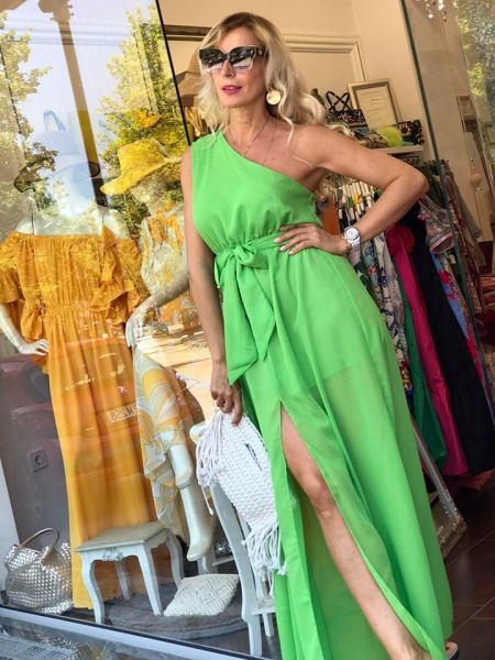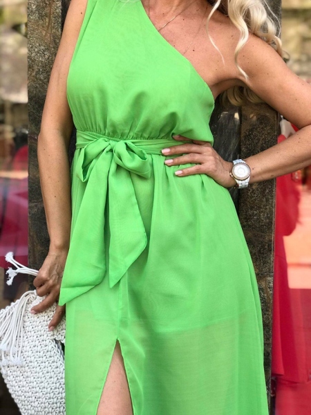 Дълга рокля в зелен цвят с едно рамо.Модела е с ластик на талията и цяпка отпред. С подплата която е по-къса.
