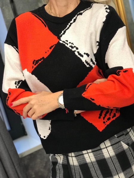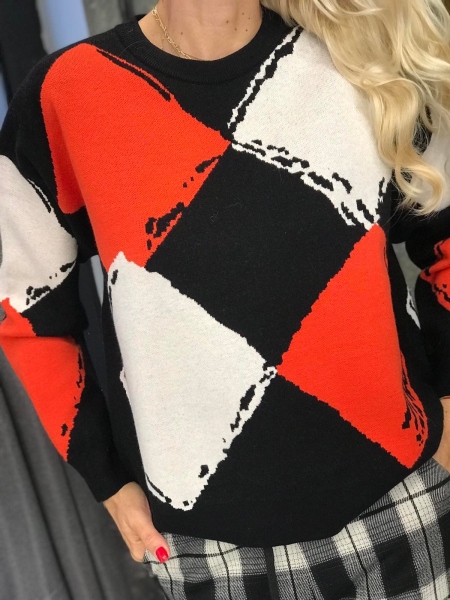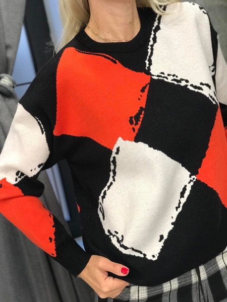 Пуловер от плътна материя със свободен силует. Размерът е универсален и е подходящ за M, L.
