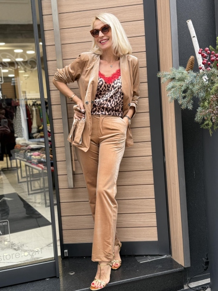 Комплект сако и панталон в бежов цвят от кадифена материя. Сакото е с втален силует, закопчаване с копчета и колан за вталяване. Панталонът е с свободни крачоли и се закопчава с цип и копче.