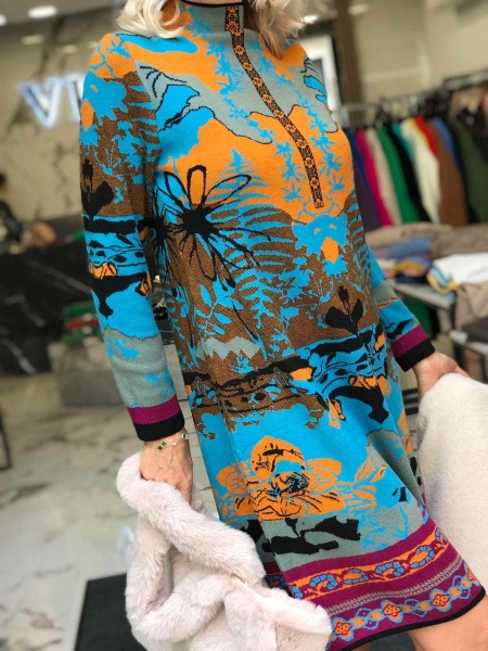 Рокля от мека и топла материя с цветен десен. Моделът е със свободен силует. Размерът е универсален и е подходящ заS, M, L.
