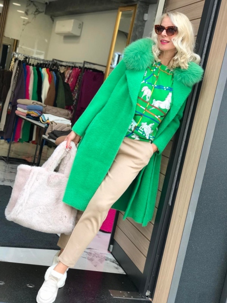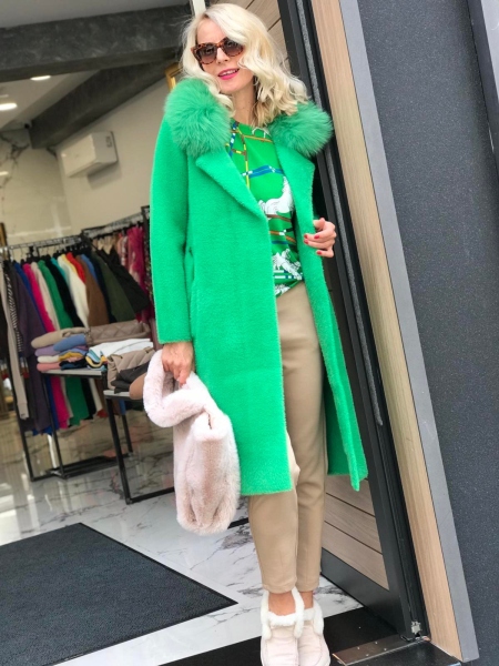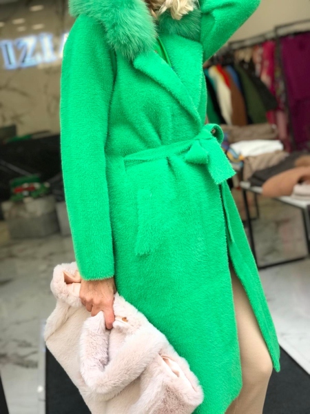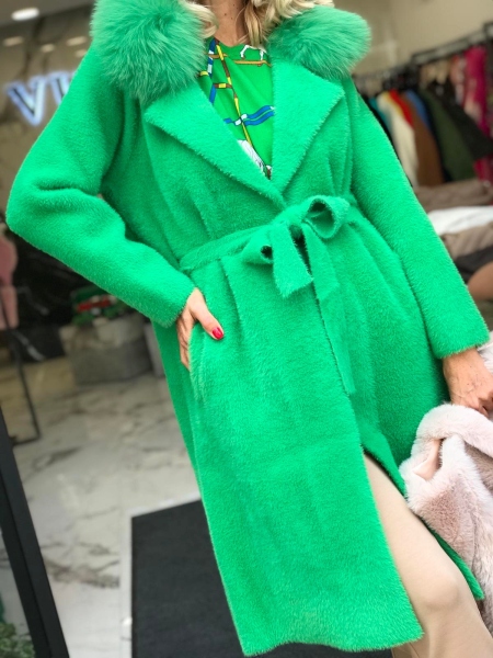 Палто в зелен цвят от кашмирена материя. Моделът се закопчава с едно копче и има колан на талията. Има яка с естествен косъм, която може да се сваля. Размерът е универсален и е подходящ за S, M, L.