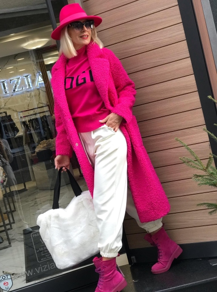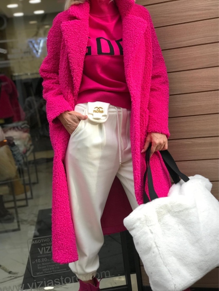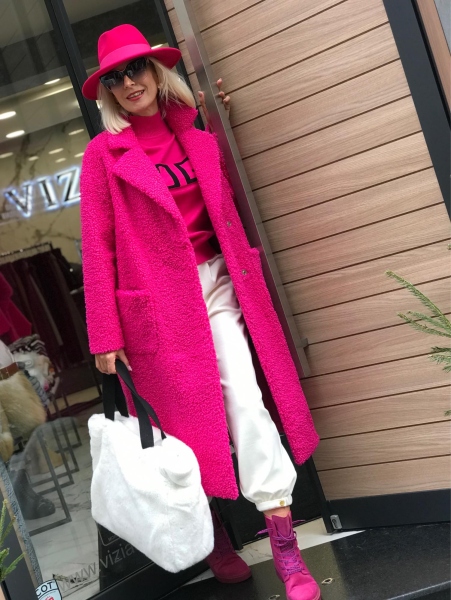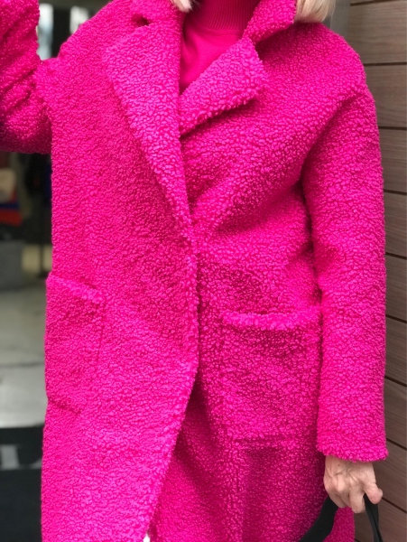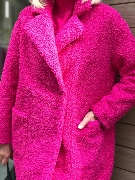 Палто в цикламен цвят  от естествена агнешка вълна. Моделът е със свободен силует и дължина под коляното. Закопчава се с копчета и има странични джобове.