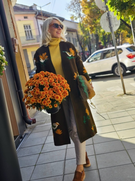 Дълга жилетка от мека кашмирена материя в маслено зелен цвят. Моделът е със свободен силует без закопчаване. Джобовете са декорирани с естествен косъм. Размерът е универсален и е подходящ за S, M, L.