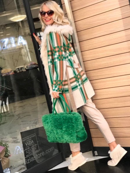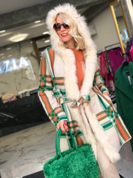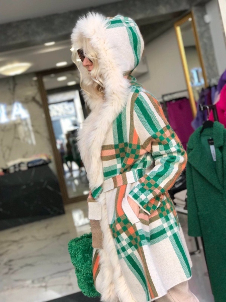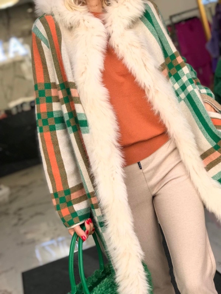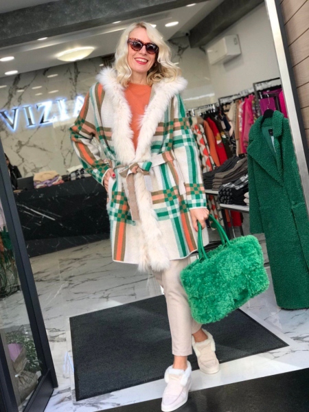 Жилетка от мека кашмирена материя с декорация от естествен косъм. Моделът е със свободен силует и има към нея колан за вталяване. Размерът е универсален и е подходящ за S, M, L.
