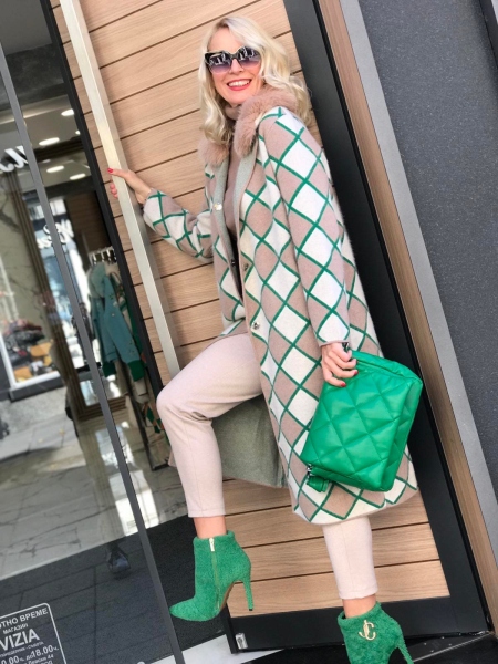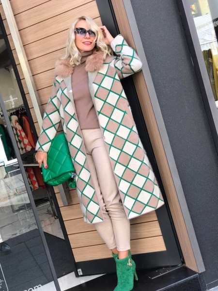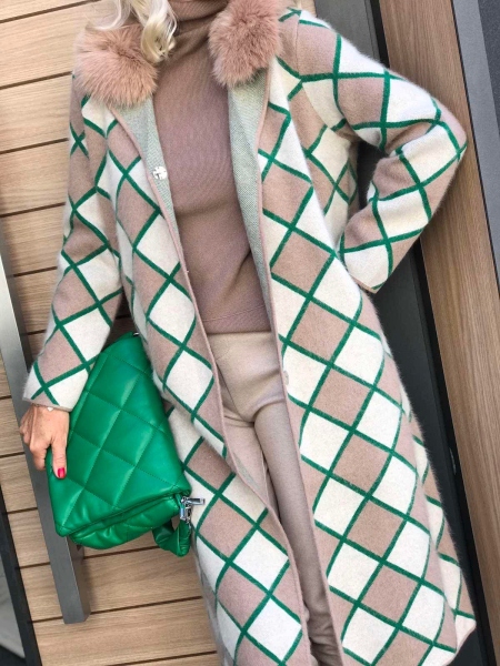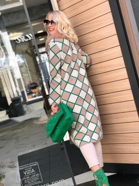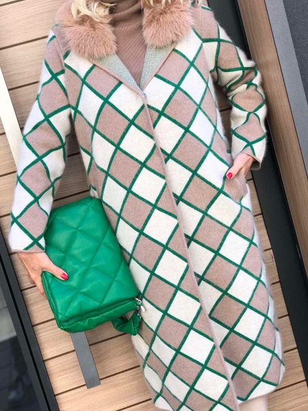 Дълга жилетка от мека кашмирена материя. Моделът е с прав силует и се закопчава с копчета. По яката е декорирана с естествен косъм. Размерът е универсален и е подходящ за S, M, L.
