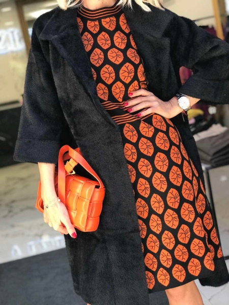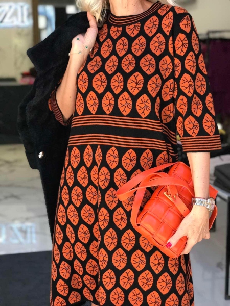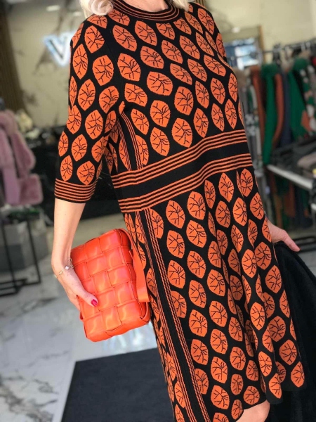 Рокля от мека и топла материя с цветен десен. Моделът е със свободен силует. Размерът е универсален и е подходящ за M, L, XL.