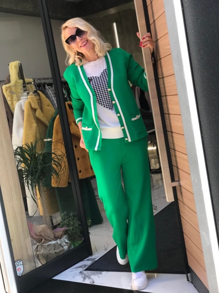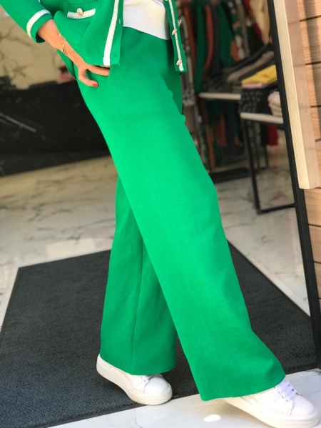 Комплект от жилетка и панталон в тревисто зелен цвят. Жилетката е със свободен силует и се закопчава с копчета. Панталонът е с ластик в талията и широки крачоли. Размерът е универсален и е подходящ за S, M, L.
