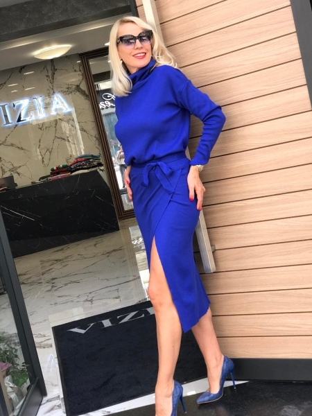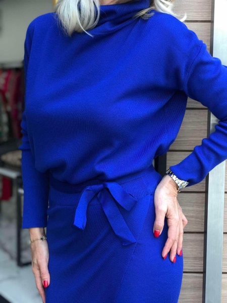 Комплект от фино плетиво в син цвят. Горната част е пуловер с поло яка със свободен силует. Полата е с прехвърляне и има ластик в талията. Размерът е универсален и е подходящ за S, M.