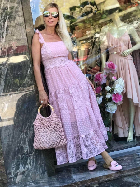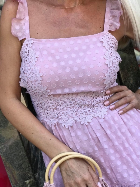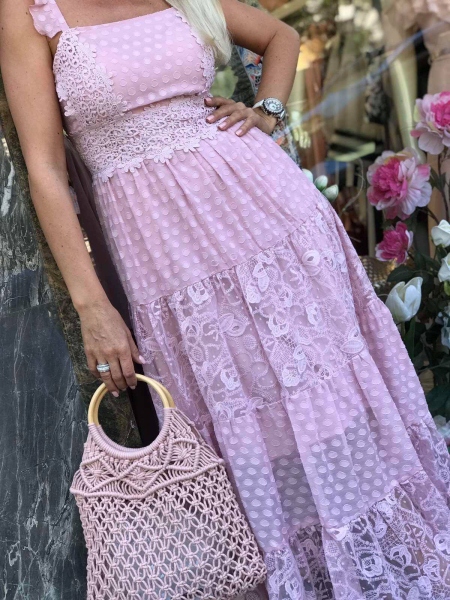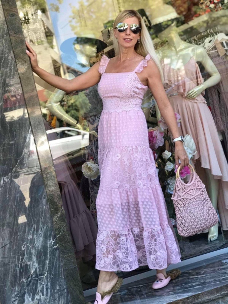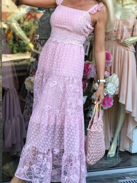 Дълга рокля в светло розов цвят с тънки презрамки и шев на талията.Модела е декориран с едра дантела.С подплата.