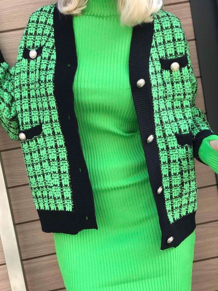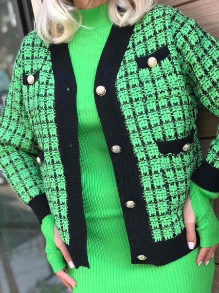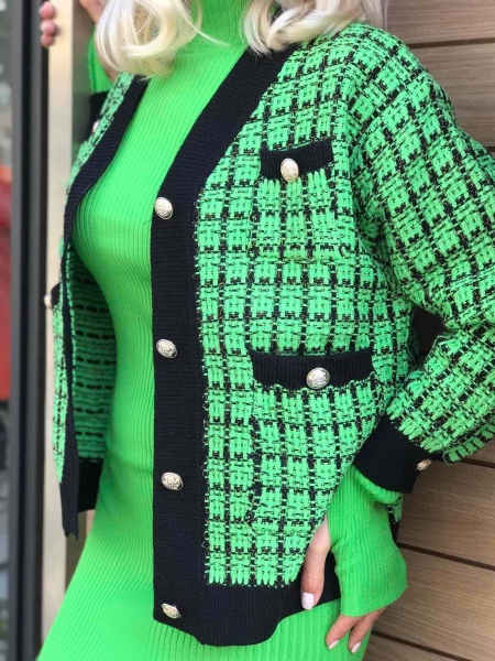Жилетка със свободен силует в зелен цвят с каре десен. Моделът се закопчава с копчета. Размерът е универсален и е подходящ за S, M, L.