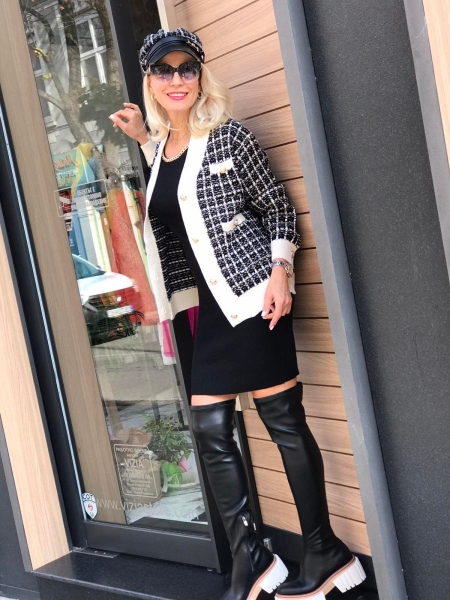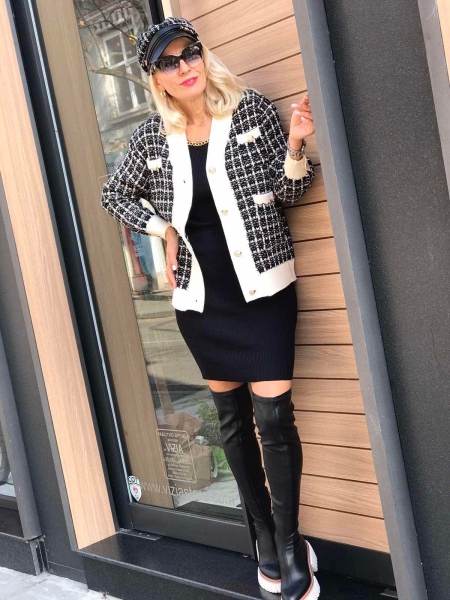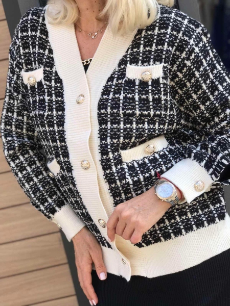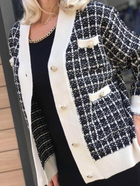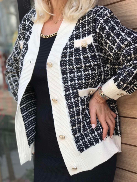 Жилетка със свободен силует в черен цвят с каре десен. Моделът се закопчава с копчета. Размерът е универсален и е подходящ за S, M, L.