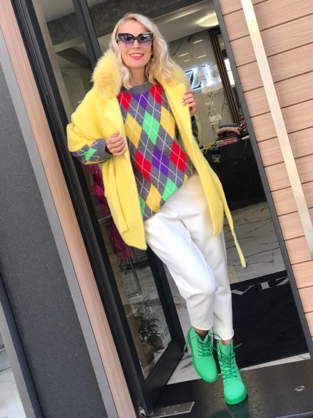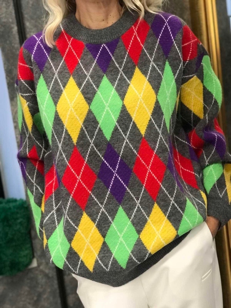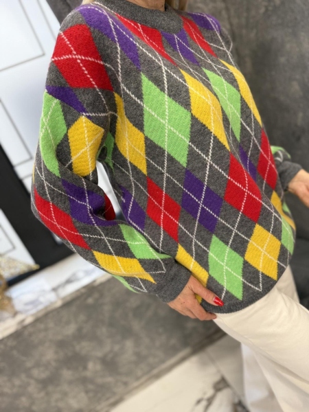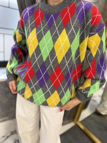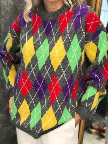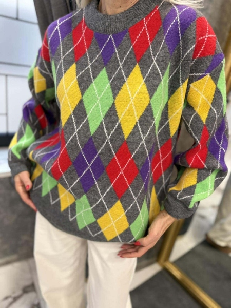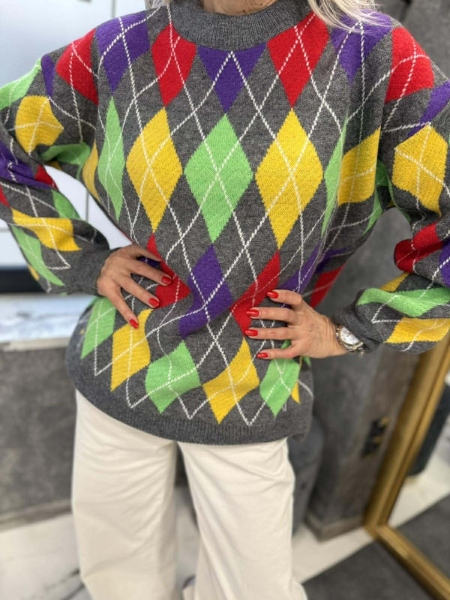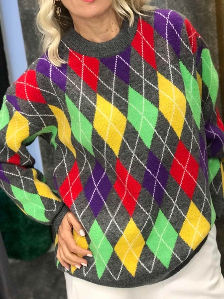 Блузон- пуловер от мека и плътна материя с цветен десен. Моделът е със свободен силует. Размерът е универсален и е подходящ за M, L, XL.
