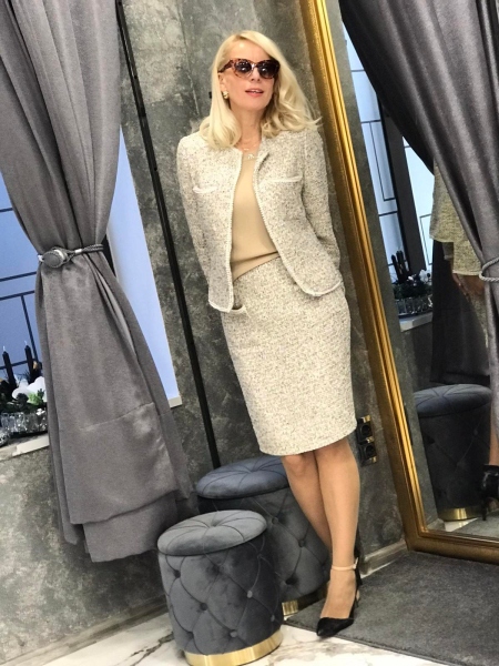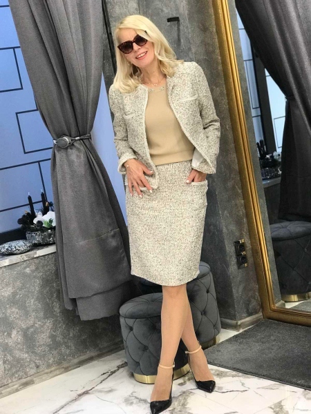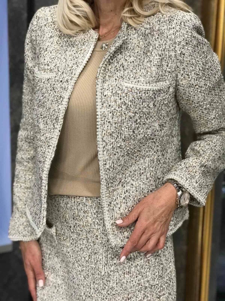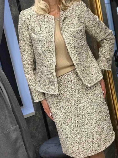 Комплект сако с пола от букле. Сакото е скъсено с права кройка без закопчаване. Полата е по тялото и се закопчава с цип.