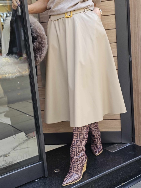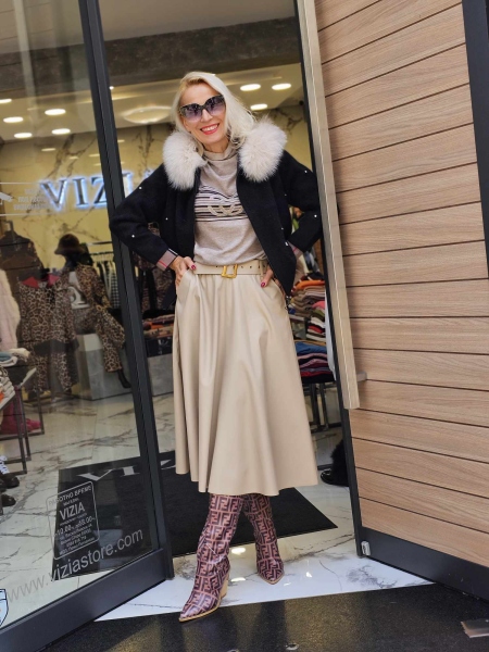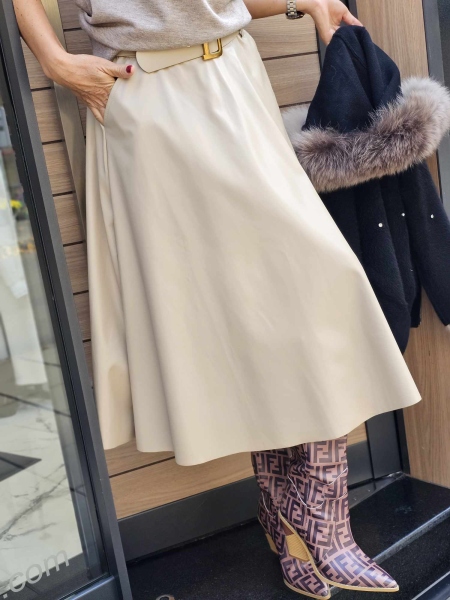 Пола от еко кожа в бежов цвят с колан. Моделът е с прав силует и е с ластик в талията. Размерът е универсален подходящ за S/M.
