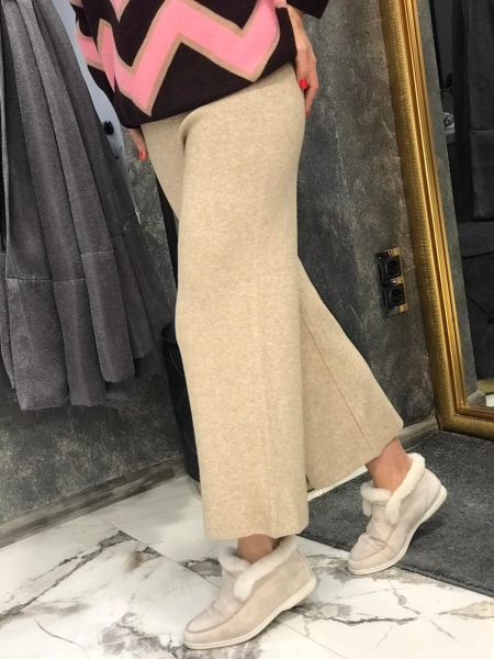 Панталон в бежов цвят от фино плетиво. Моделът е с ластик в талията и с широки крачоли. Размерът е универсален и е подходящ за S/M.