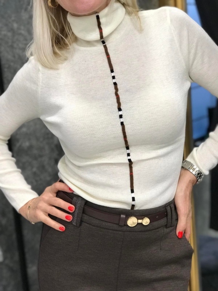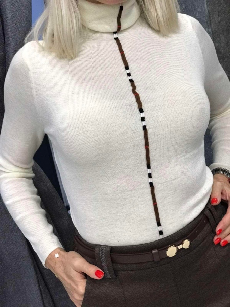 Поло от фино плетиво в цвят екрю. Моделът е с втален силует. Размерът е универсален и е подходящ за S/M.