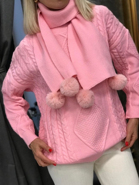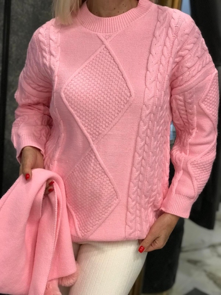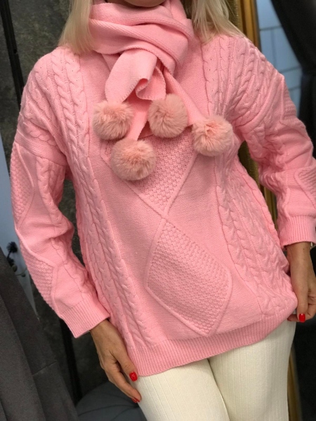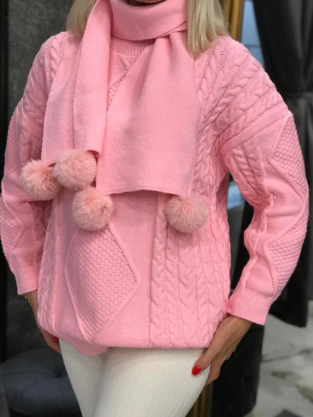 Пуловер oversize в розов цвят от плътна и мека материя. Моделът е със свободен силует подходящ за M, L, XL. Към него има аксесоар шал.