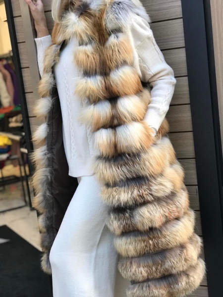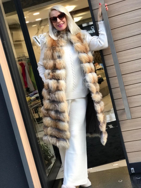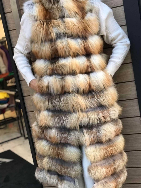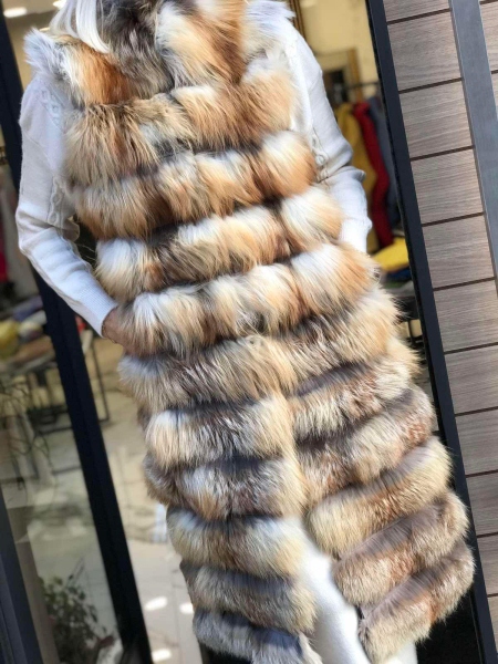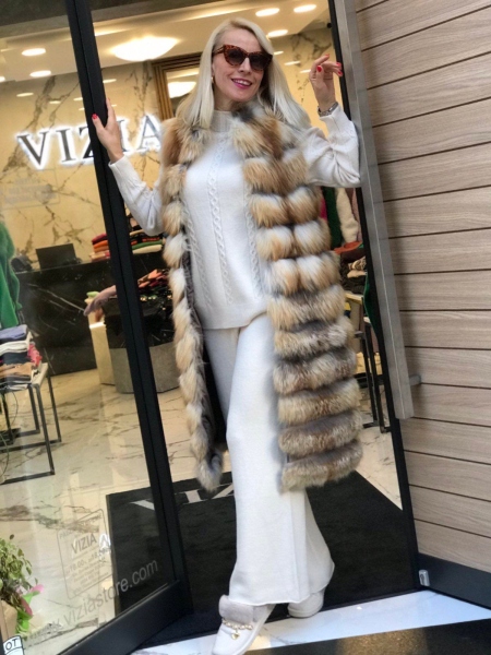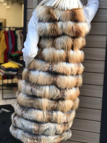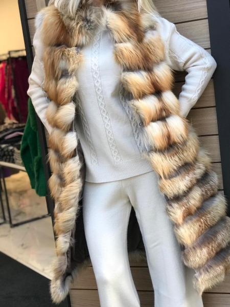 Елек от естествен пух в натурален цвят. Моделът е със свободен силует. Елекът има възможност да се носи в две дължини като долната част се отделя с цип. Размерът е универсален и е подходящ за S размер.
