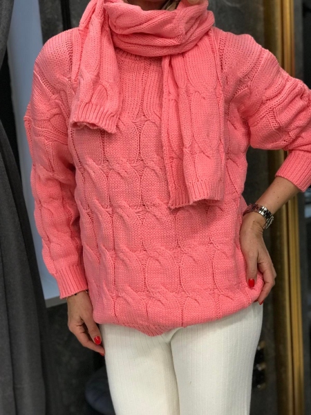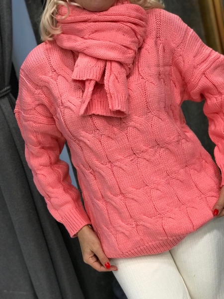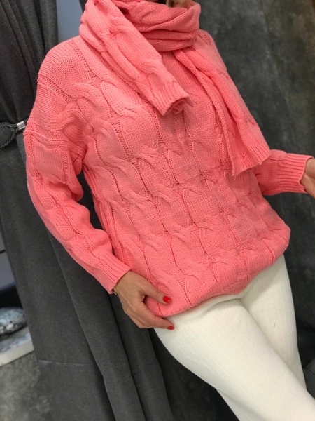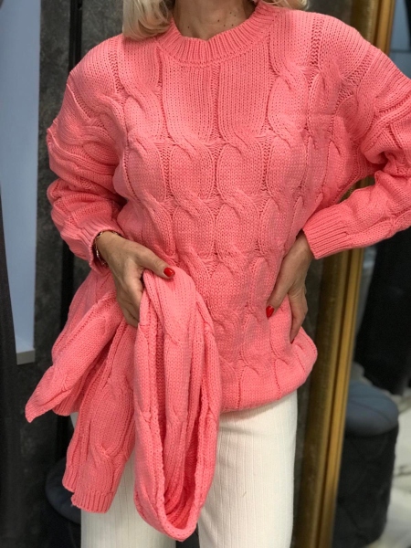 Пуловер oversize в бонбонен цвят от плътна и мека материя. Моделът е със свободен силует подходящ за M, L, XL. Към него има аксесоар шал.