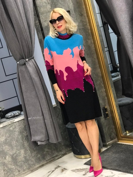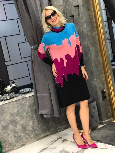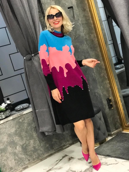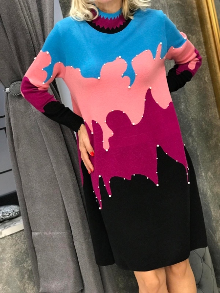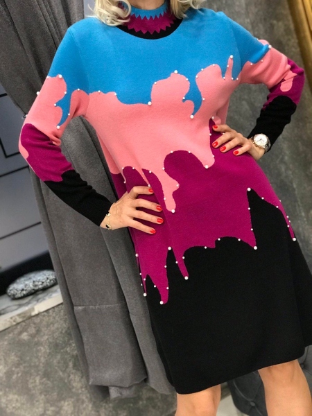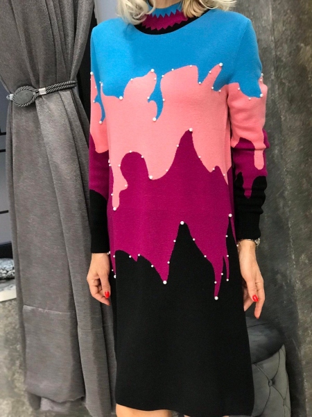 Рокля от фино плетиво с цветен десен. Моделът е със свободен силует. Размерът е универсален и е подходящ за S, M, L.