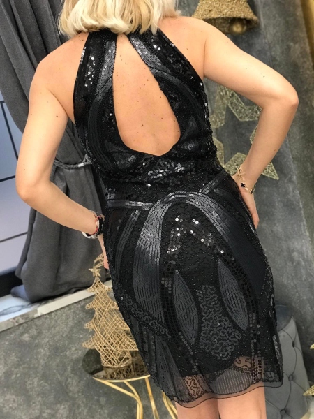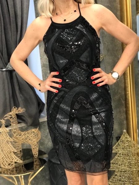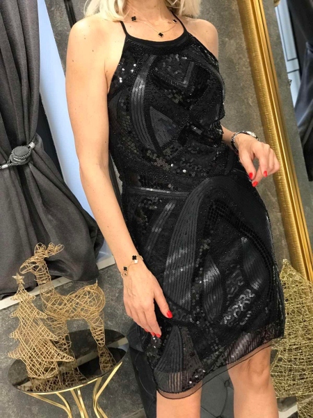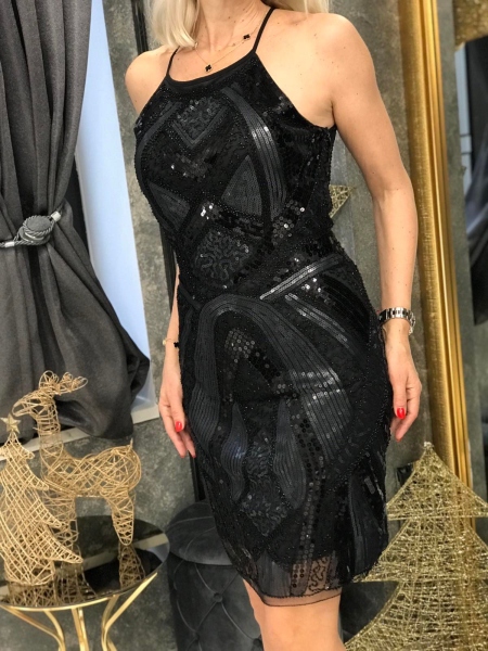 Рокля с втален силует в черен цвят. Моделът е декориран изцяло с пайети. Роклята се облича без закопчаване. Размерът е универсален и е подходящ за M/L.