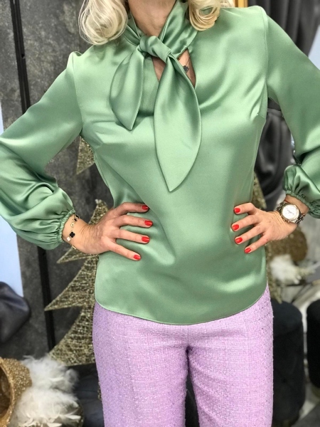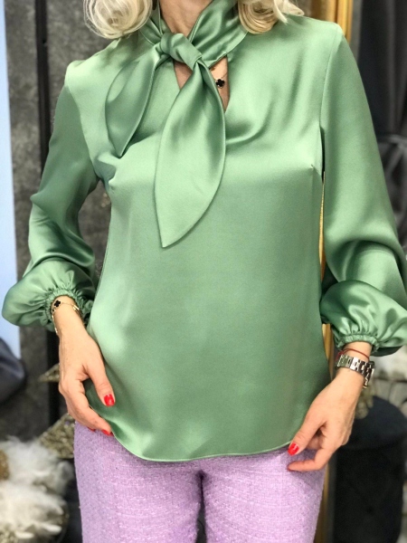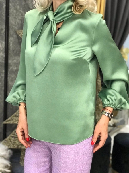 Риза със свободен силует от сатенена материя. Моделът се облича без закопчаване.