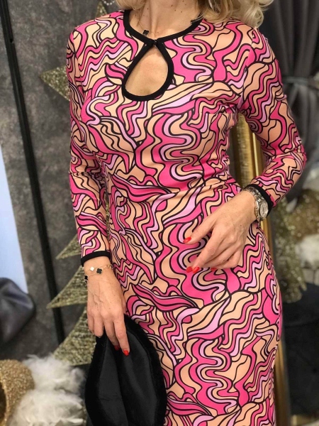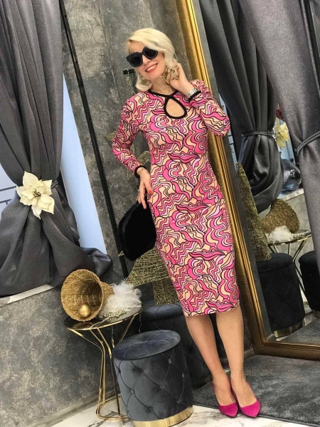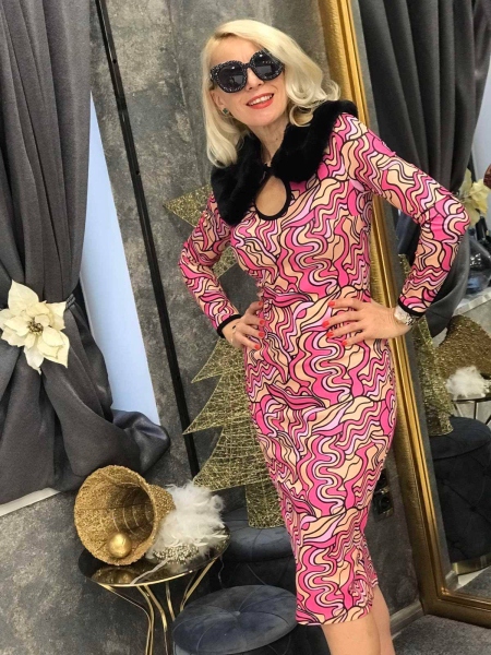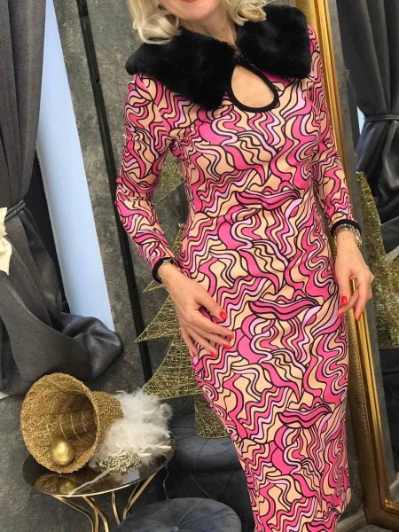 Рокля по тялото с дължина под коляното. Моделът се закопчава с цип. Към нея има пухкава яка, която може да се сваля.