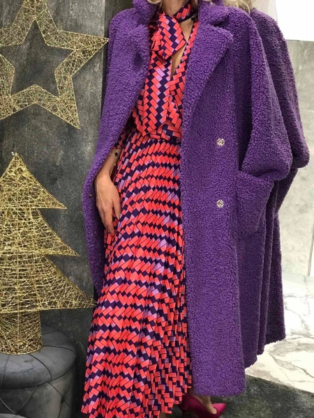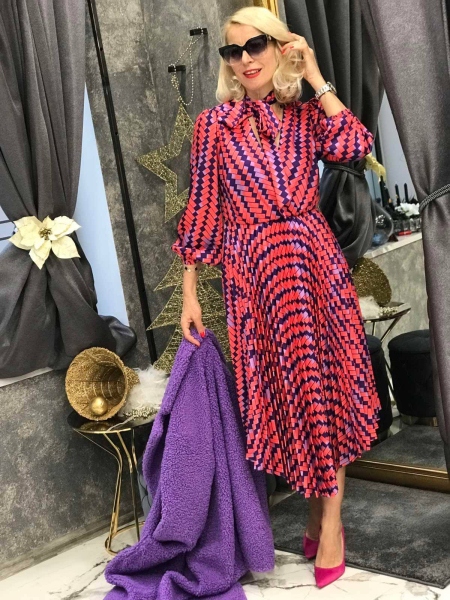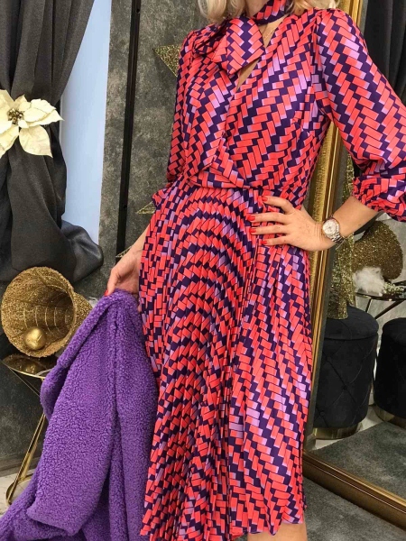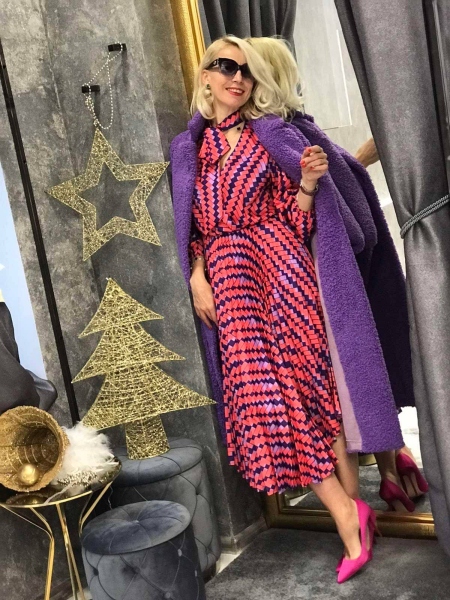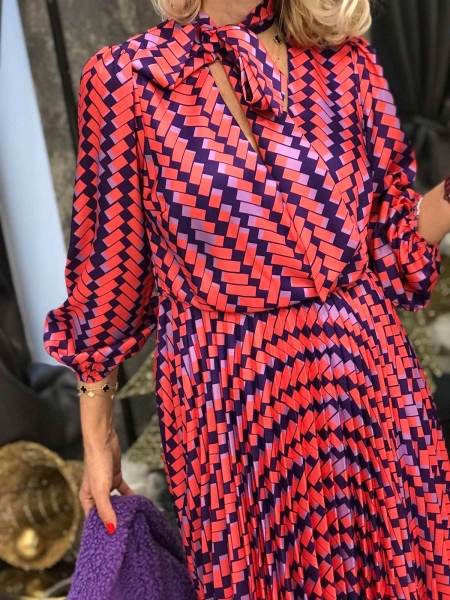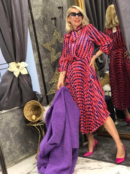 Рокля от тънка материя в пъстри цветове. Моделът е с ластик на талията и се облича без закопчаване.