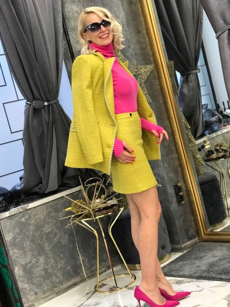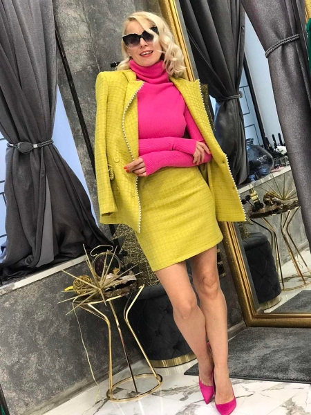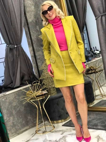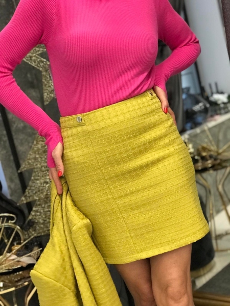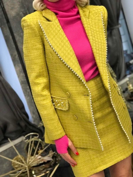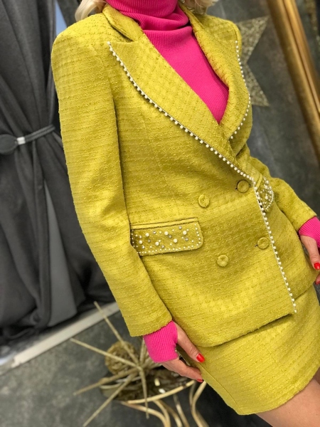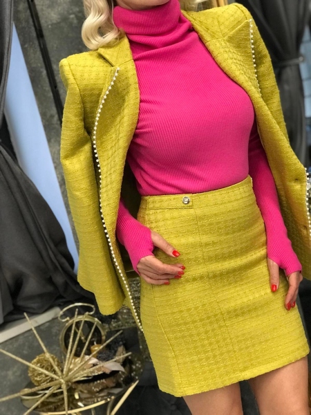 Комплект сако с пола от букле в цвят лайм. Сакото е с втален силует и двуредно закопчаване. Полата е по тялото и се закопчава с цип.